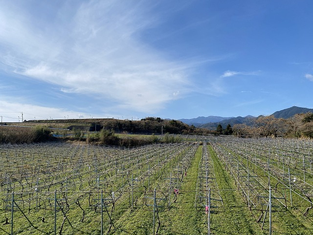 尾鈴山と冬の静けさに包まれたブドウ畑。