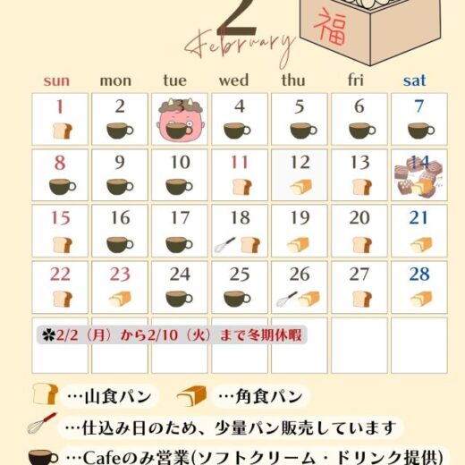 こんにちは!TSUNOWINE&BAKERYです!2月の営業日程をご報告させていただきます。 2月3日~6日は、勝手なが...